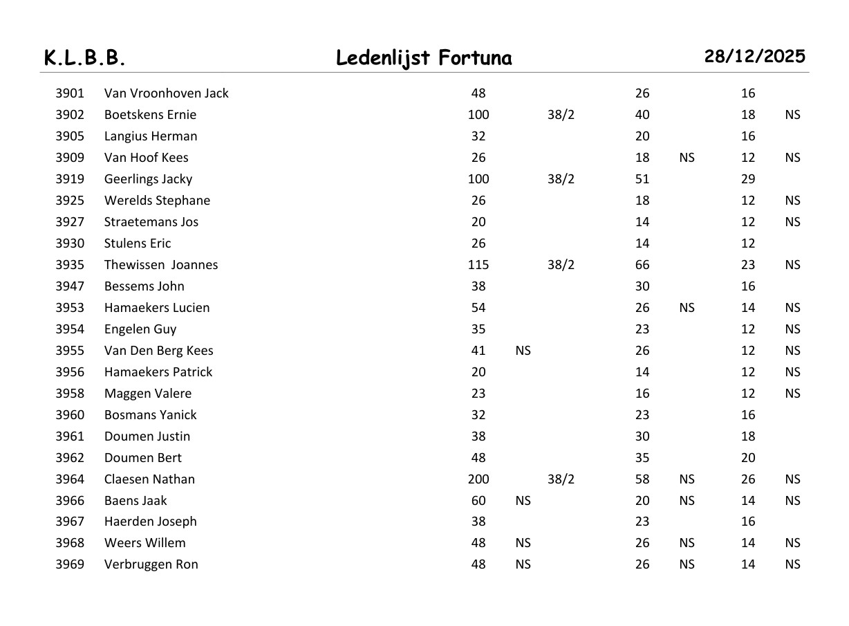 KLBB KLASSEMENT EN UITSLAGEN 2025 - 2026